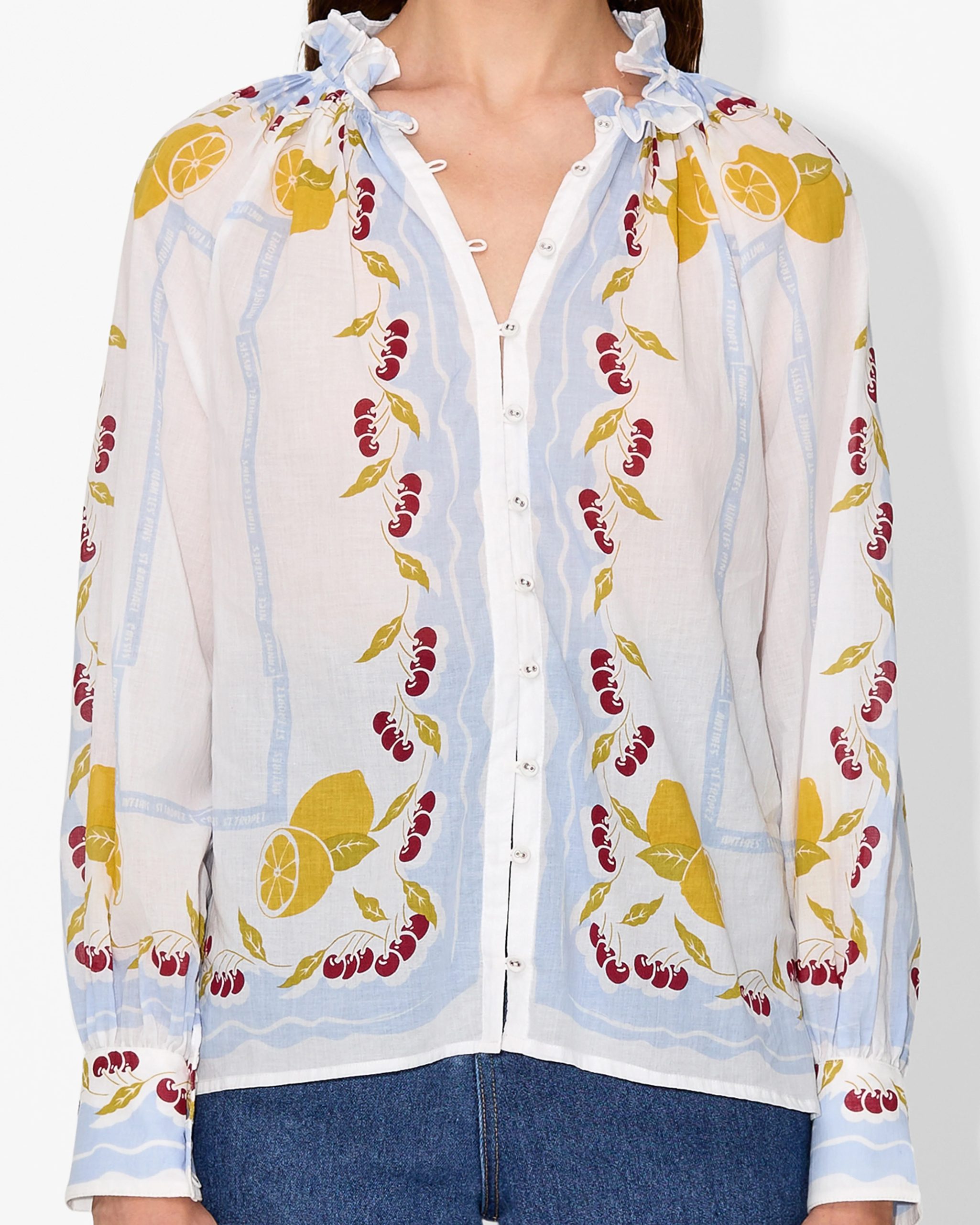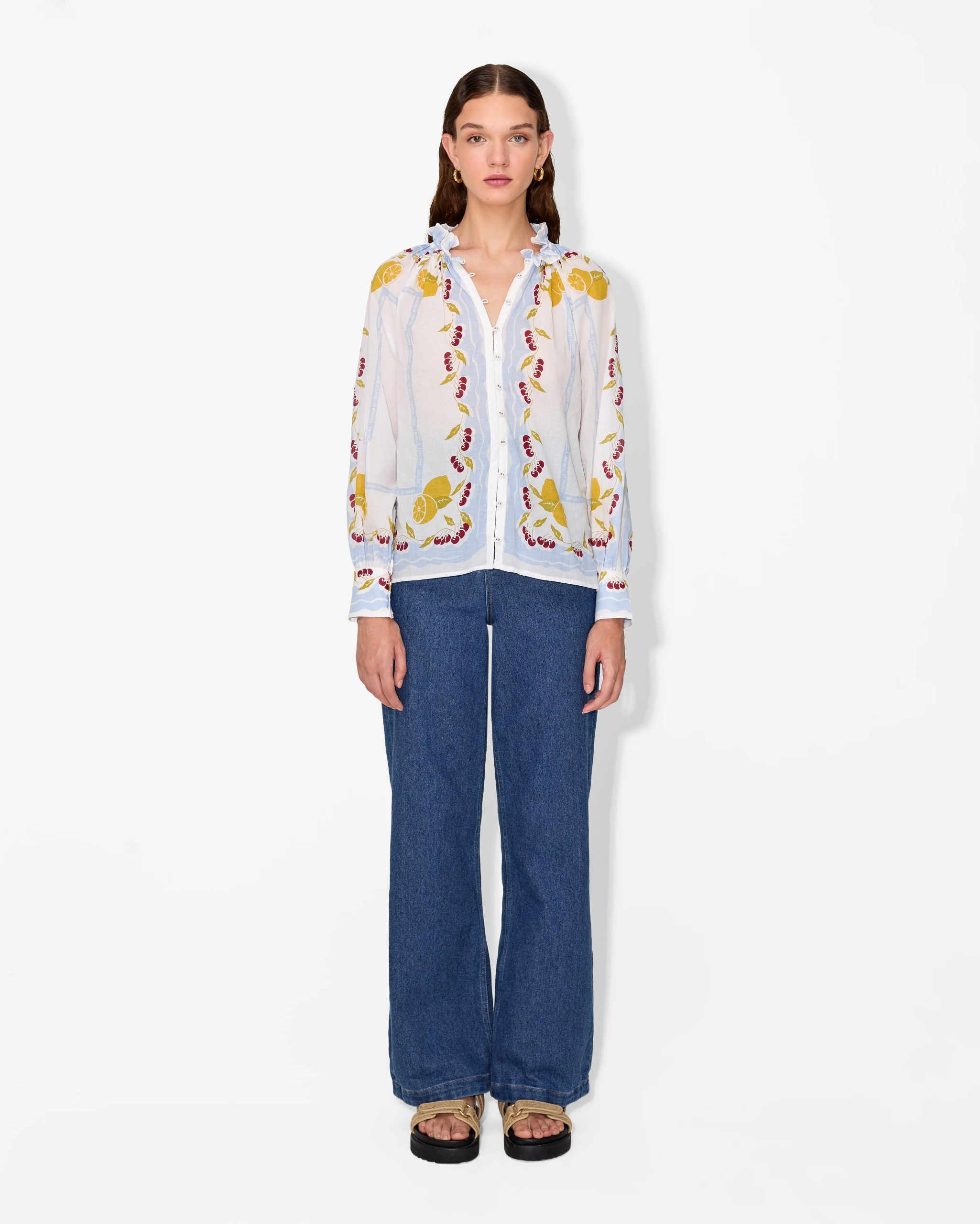 This exquisite blouse is crafted from a lightweight, sheer fabric, blending 70% cotton and 30% polyester for an airy and breathable feel. The intricate embroidery, featuring vibrant fruit motifs in yellow and red, adds a playful yet sophisticated touch. The scalloped edges and delicate bow tie details on the collar elevate its feminine charm.