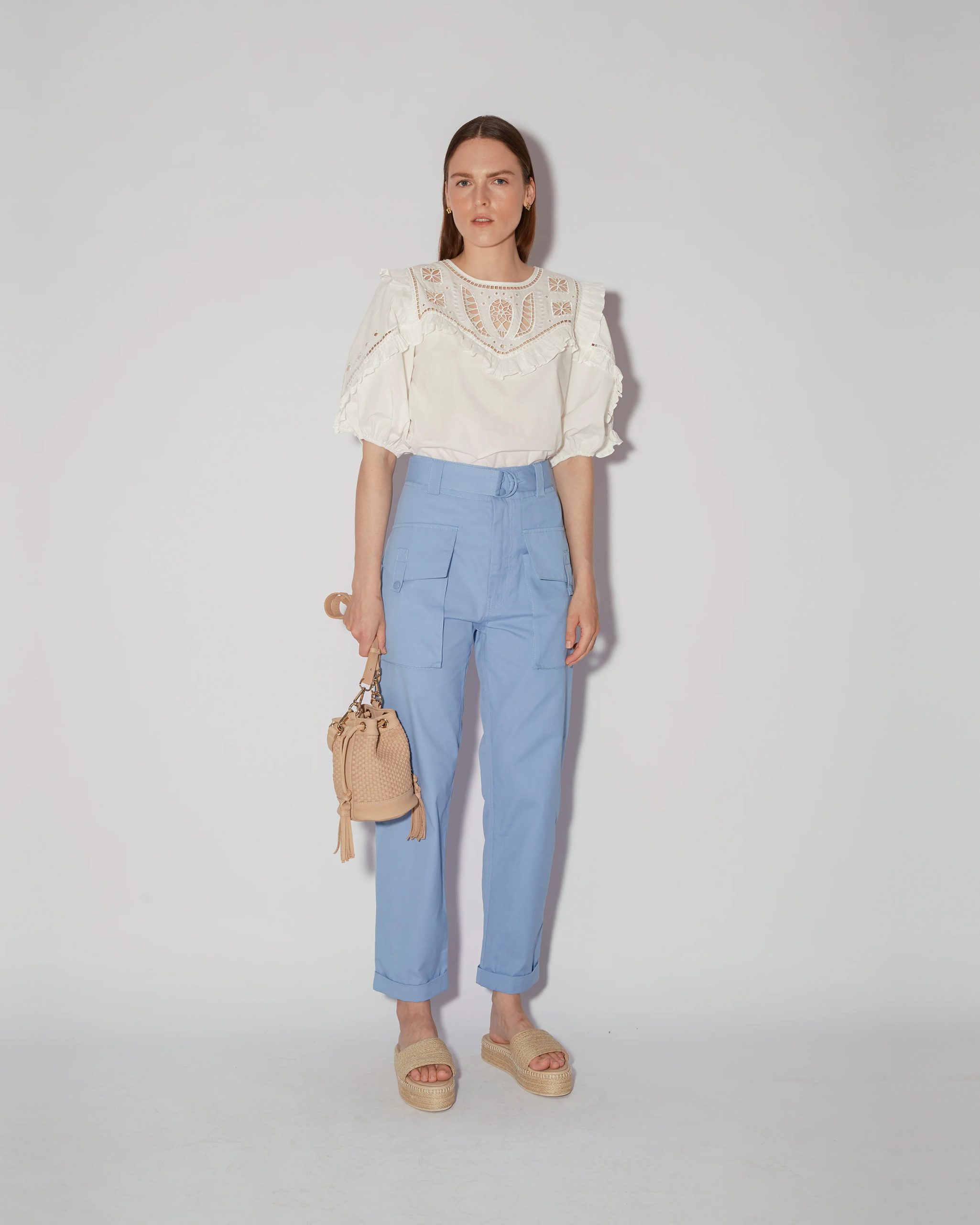The blouse features romantic ruffled accents along the neckline and shoulders, enhancing its feminine charm. The voluminous puffed sleeves are adorned with matching embroidery and ruffles, adding a playful yet elegant touch. The back closure is secured with a subtle button, ensuring a perfect fit.