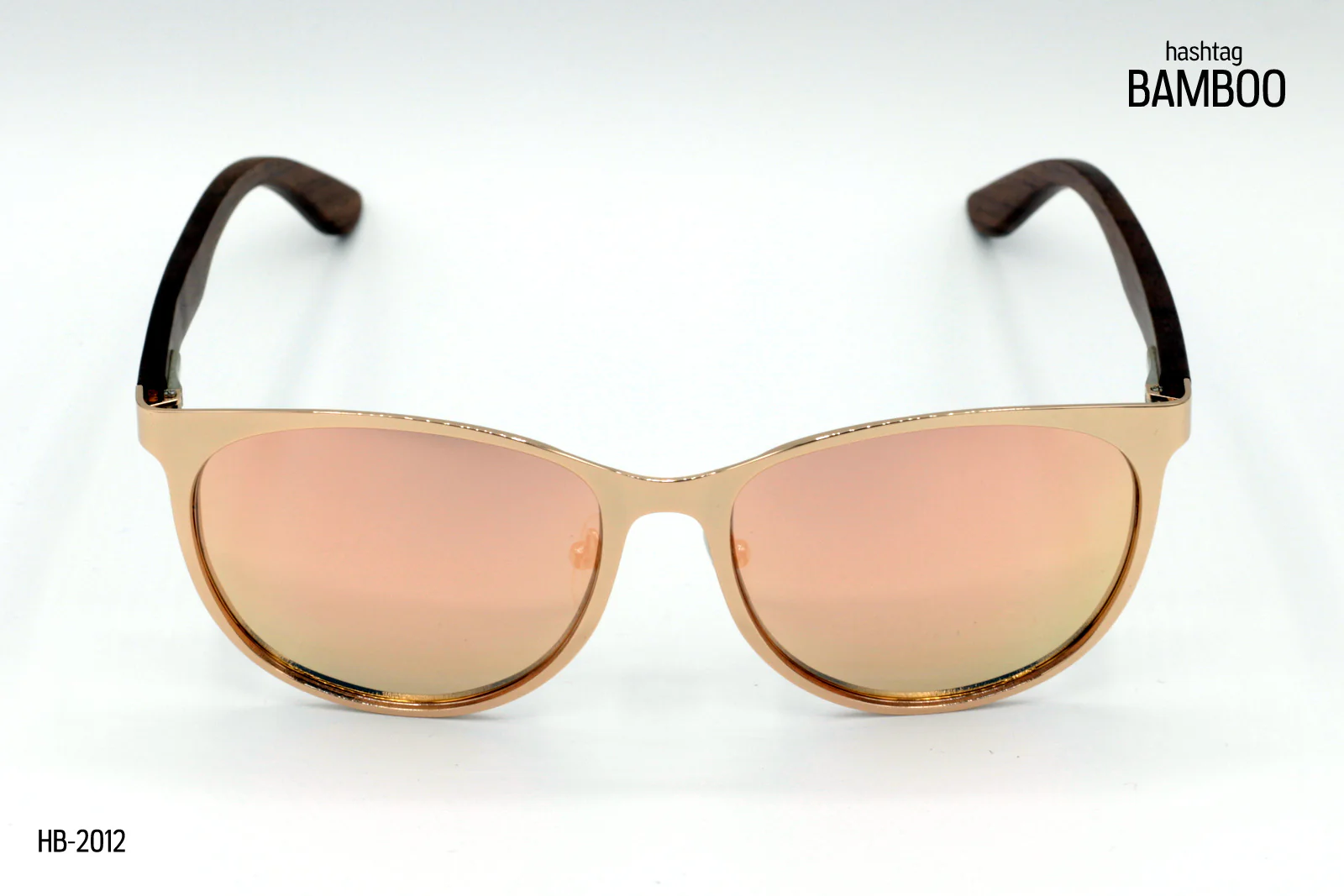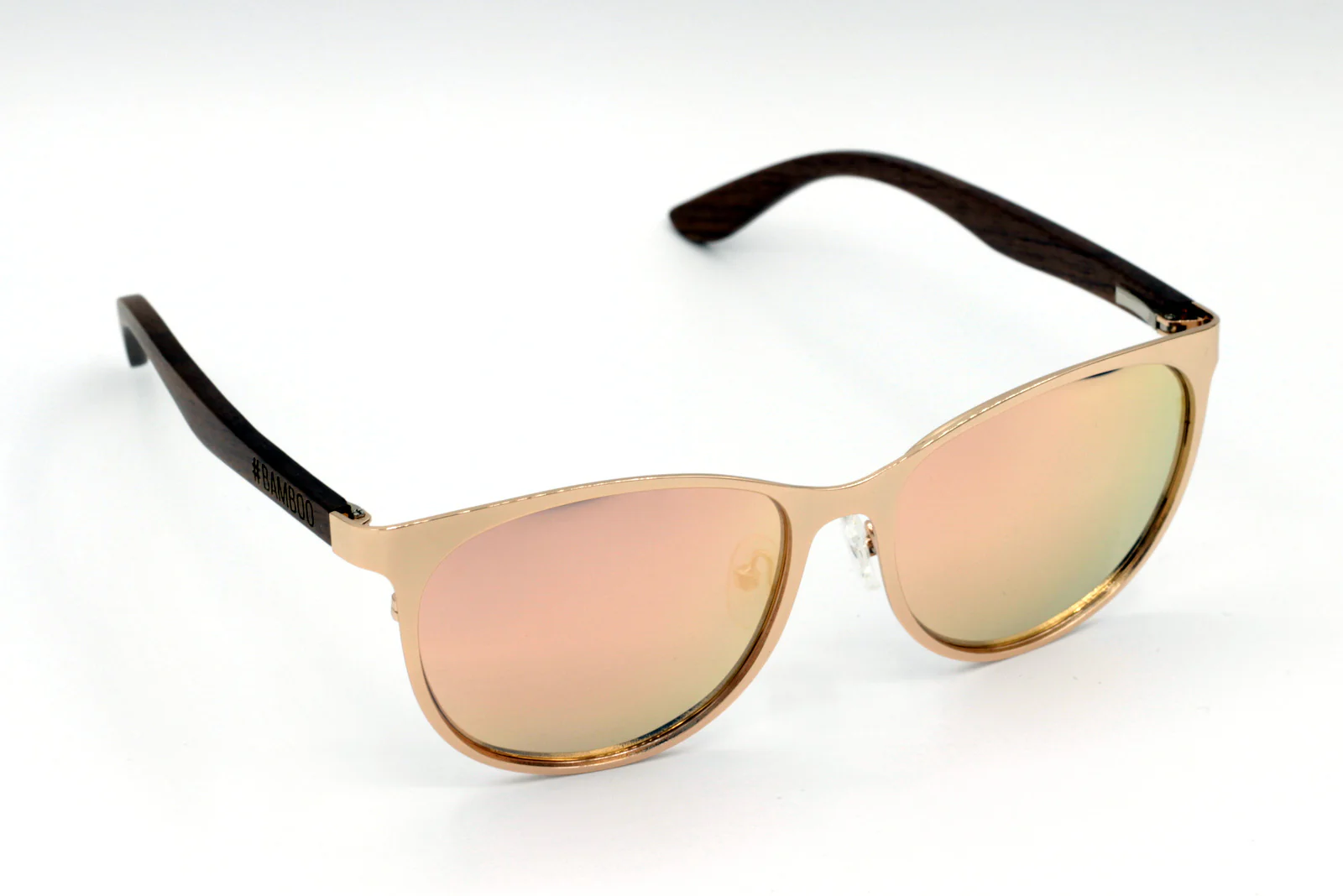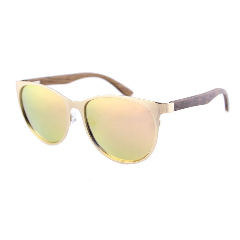 These sunglasses feature a contemporary design that combines practicality and style. The frame is crafted from durable and lightweight polycarbonate material, making it suitable for extended wear without causing discomfort. The temples are made from eco-friendly, polished wood, offering a natural aesthetic that complements the modern gold-tone finish of the frame.